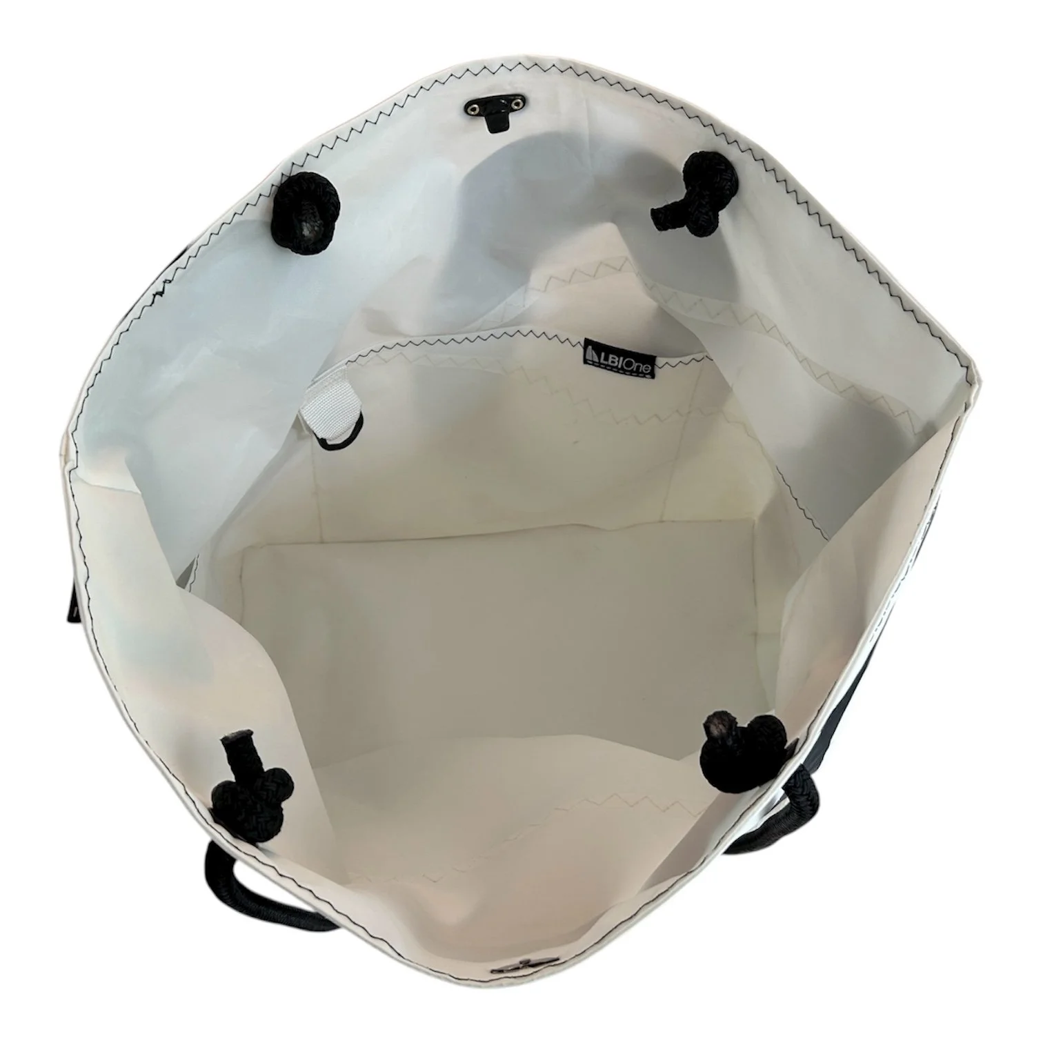 Elevate your adventures with the LBI One Large Tote, crafted from durable recycled white Dacron sailcloth. Built to perform, this iconic sail material is celebrated for its rugged strength, UV resistance, and unmistakable nautical character. Featuring the original sail number “100”, bold black accent stitching, and all-black hardware, this spacious tote is ready to take you from boat days and beach trips to everyday errands—with room to spare and a story to tell.
